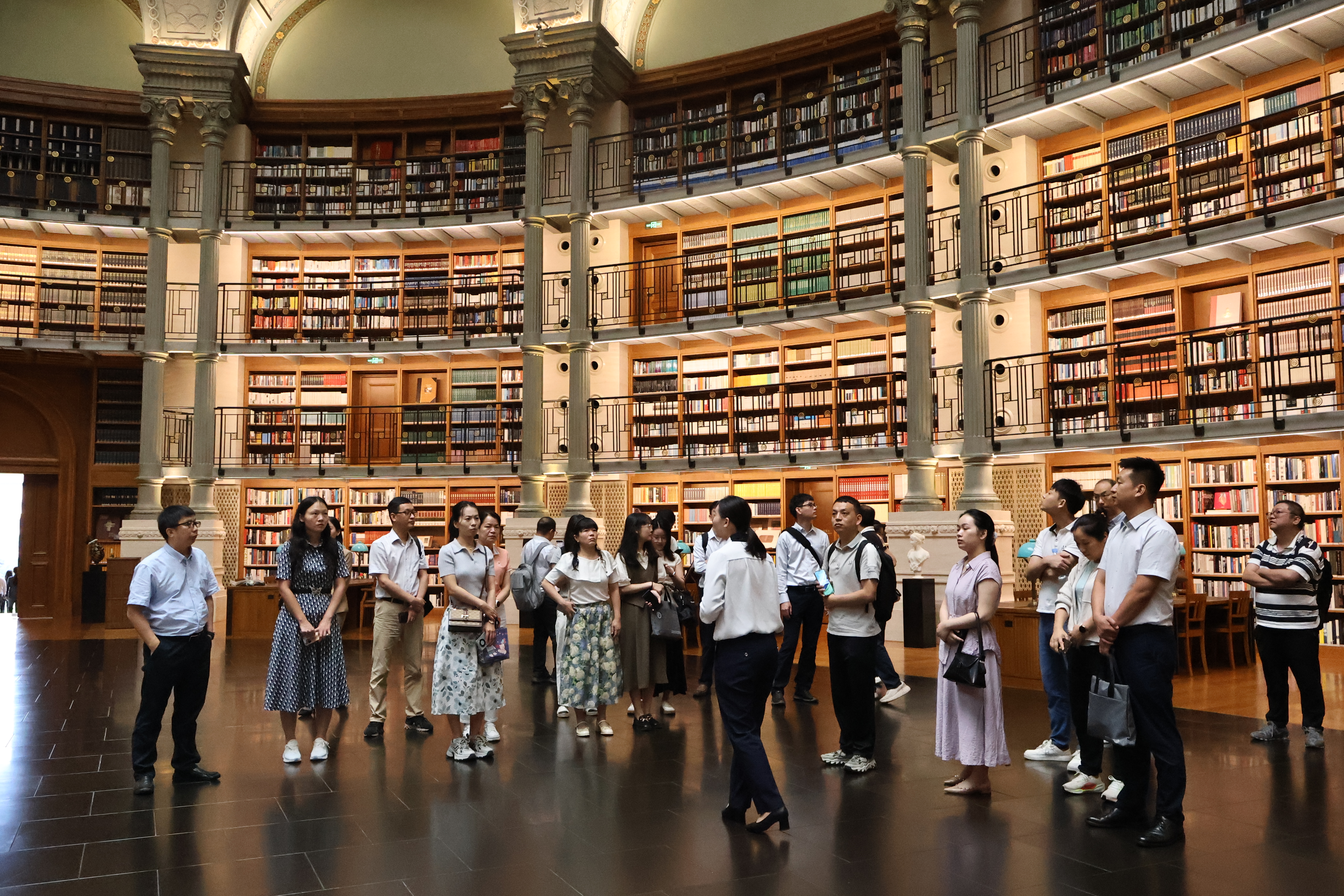 人才代表們首先來到華為三丫坡圖書館參觀。這座新古典主義建筑以法國國家圖書館黎塞留館、尚蒂伊古堡為設(shè)計藍本,橢圓大廳由16組銅鑄羅馬柱支撐,穹頂鑲嵌16扇圓窗,對應北京、巴黎、羅馬等16座文明古城的銘牌,柱體雕刻哲學、天文、法律等學科圖標,象征全球知識體系的融合。全館共珍藏11萬冊書籍涵蓋20種語言,淋漓盡致地體現(xiàn)了華為“知識共享與思想碰撞”的文化內(nèi)核。人才代表們沉浸在這個由數(shù)字技術(shù)賦能的文化空間里,細細觀賞中不時發(fā)出贊嘆。