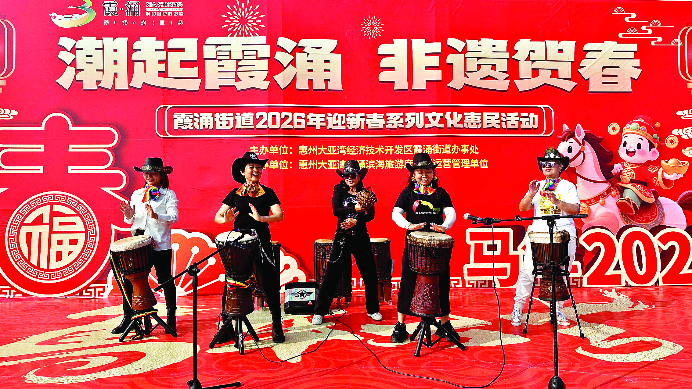活動(dòng)中,來自香港、深圳、上海、惠州的鼓友齊聚一堂,激昂鼓聲與悠揚(yáng)歌聲交織回蕩。一首首經(jīng)典歌曲,巧妙融合非洲鼓以及霞涌濱海風(fēng)情與潮流元素,以動(dòng)感旋律點(diǎn)燃現(xiàn)場氛圍,為市民獻(xiàn)上一場年味十足的視聽盛宴。