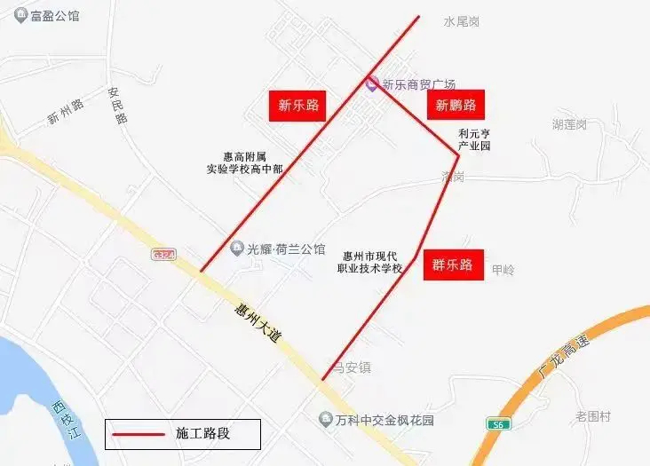 5月13日至施工結(jié)束(工期預(yù)計(jì)19個(gè)月)施工期間,將圍蔽群樂路、新鵬路、新樂路半幅路面,另一幅路面保持雙向通行。途經(jīng)車輛可選擇繞行新樂二路、新樂三路、新樂四路、新樂五路、鄉(xiāng)道YG69、惠州大道等道路。