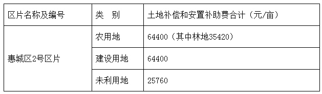 土地補(bǔ)償費(fèi)和安置補(bǔ)助費(fèi)按《惠州市人民政府關(guān)于公布實(shí)施征收農(nóng)用地區(qū)片綜合地價(jià)的公告》(惠府公〔2021〕4號)規(guī)定的惠城區(qū)2號區(qū)片綜合地價(jià)標(biāo)準(zhǔn)執(zhí)行,其中全市統(tǒng)一設(shè)定林地調(diào)節(jié)系數(shù)0.55,征收建設(shè)用地參照征收農(nóng)用地區(qū)片綜合地價(jià)執(zhí)行,征收未利用地參照征收農(nóng)用地區(qū)片綜合地價(jià)設(shè)定調(diào)節(jié)系數(shù)0.4執(zhí)行。