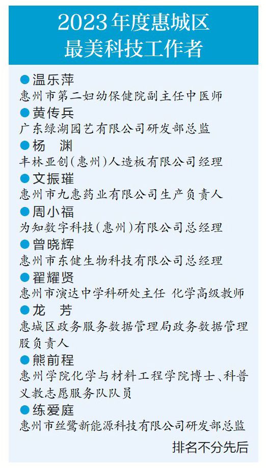 活動中,惠城區(qū)2023年度“最美科技工作者”評選結(jié)果出爐,10位“最美科技工作者”獲此殊榮。他們聚焦前沿科學(xué)問題和關(guān)鍵技術(shù)的突破,努力成為服務(wù)經(jīng)濟社會高質(zhì)量發(fā)展的推動者,成為助推科技自立自強的排頭兵。接下來,還將舉薦優(yōu)秀科技工作者參評區(qū)拔尖人才、惠州市“天鵝計劃”“廣東省丁穎科技獎”等評選活動。