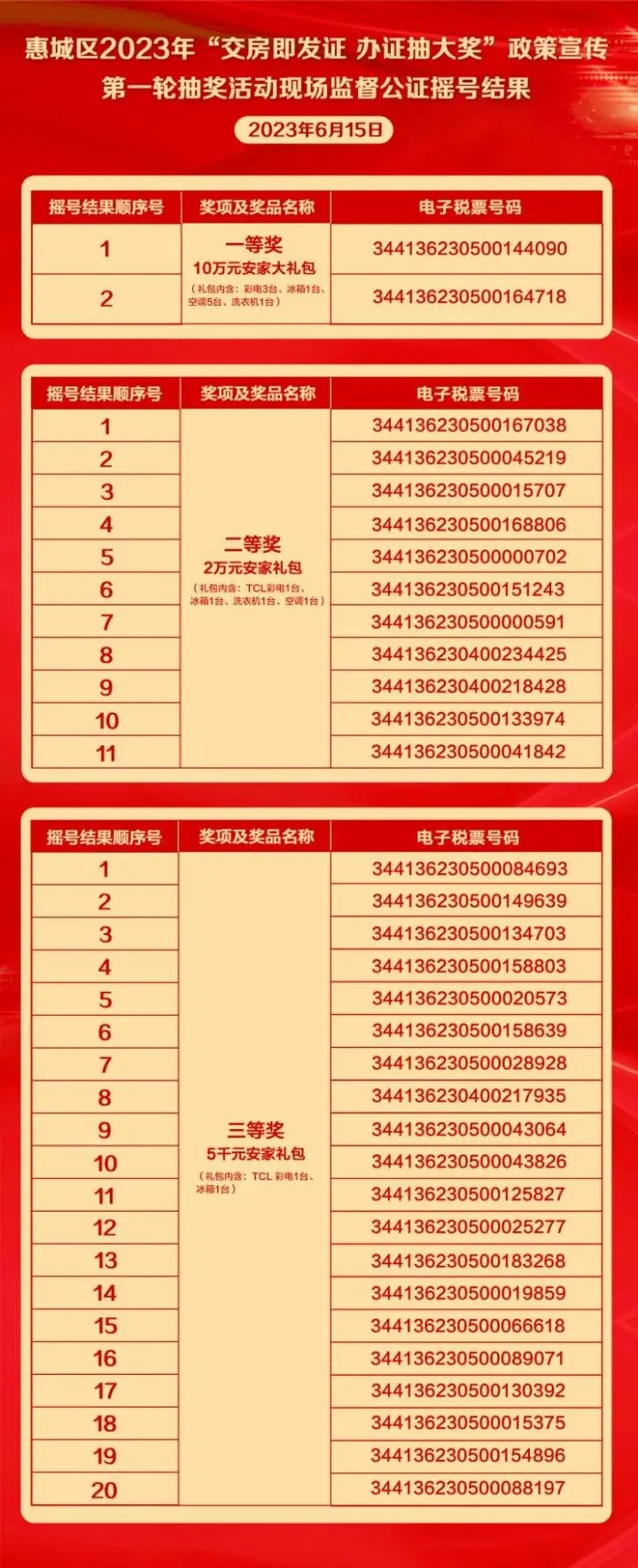 6月15日,2023年惠城區(qū)“交房即發(fā)證 辦證抽大獎(jiǎng)”政策宣傳抽獎(jiǎng)活動(dòng)第一輪直播抽獎(jiǎng)在惠奧·梵高的花園舉行,并通過惠州頭條APP進(jìn)行視頻在線直播。在惠州市陽(yáng)光公證處公證員的全程監(jiān)督以及逾15萬(wàn)在線觀眾的圍觀下共抽出了33名幸運(yùn)中獎(jiǎng)人,包括一等獎(jiǎng)2名,二等獎(jiǎng)11名,三等獎(jiǎng)20名,其中一等獎(jiǎng)的中獎(jiǎng)?wù)攉@得10萬(wàn)元安家大禮包。