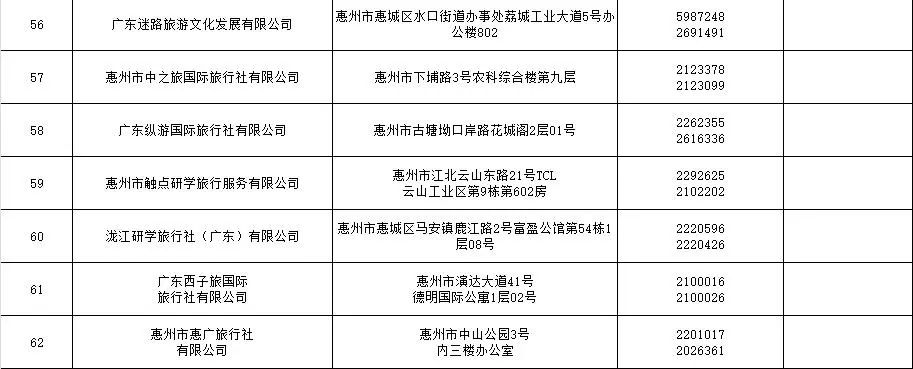 當(dāng)前,惠城區(qū)注冊備案的旅行社及分社名單如下: