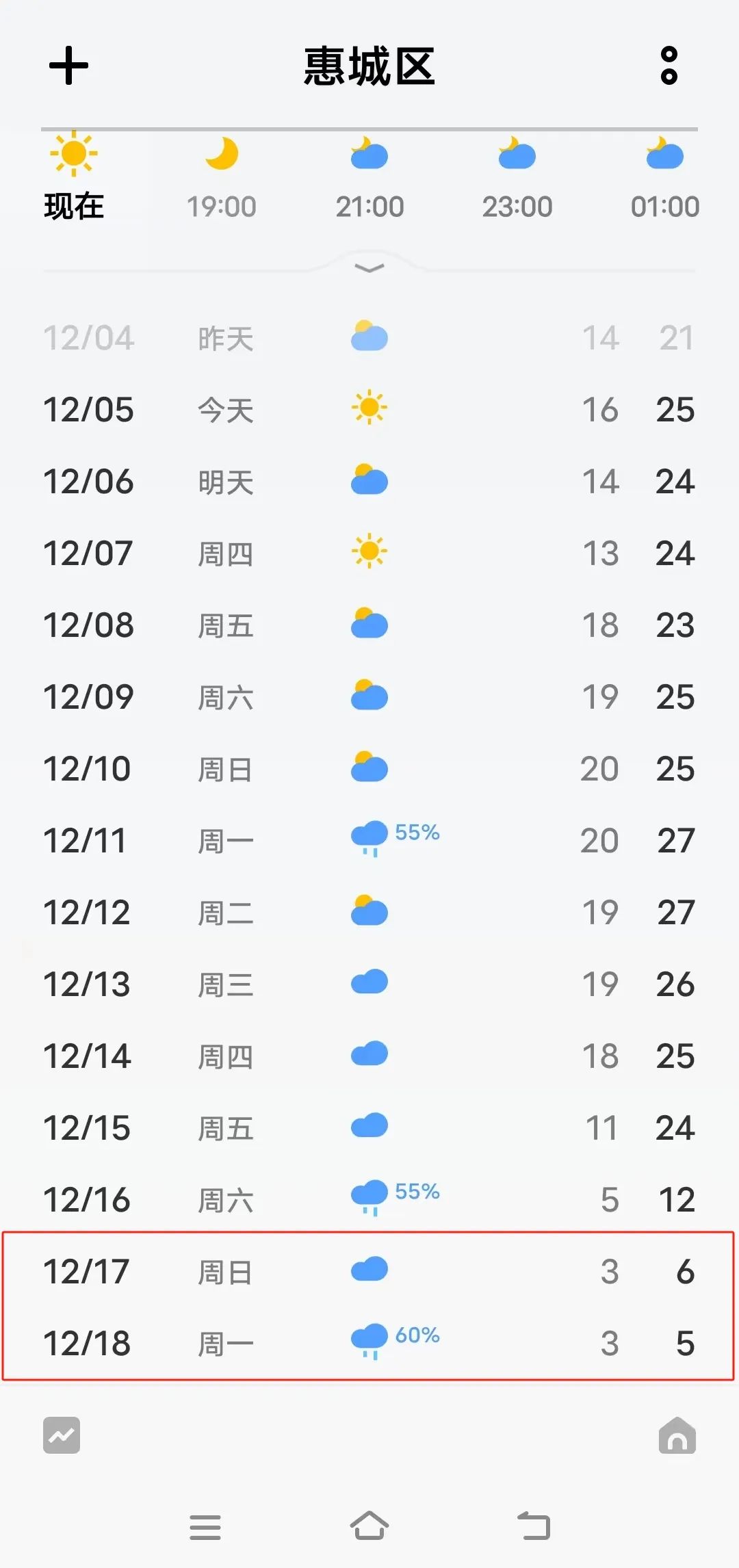 根據(jù)各網(wǎng)友發(fā)送給氣象部門的手機(jī)頁面截圖,上述截圖大致反映12月中旬廣東部分地區(qū)出現(xiàn)降溫走勢,至12月18日前后出現(xiàn)過程低溫。從預(yù)報結(jié)論看,屆時惠州惠城區(qū)最低氣溫僅2~3℃;廣州市區(qū)最低氣溫僅1℃,最高也僅3℃,不僅天氣寒冷還可能出現(xiàn)雨夾雪。