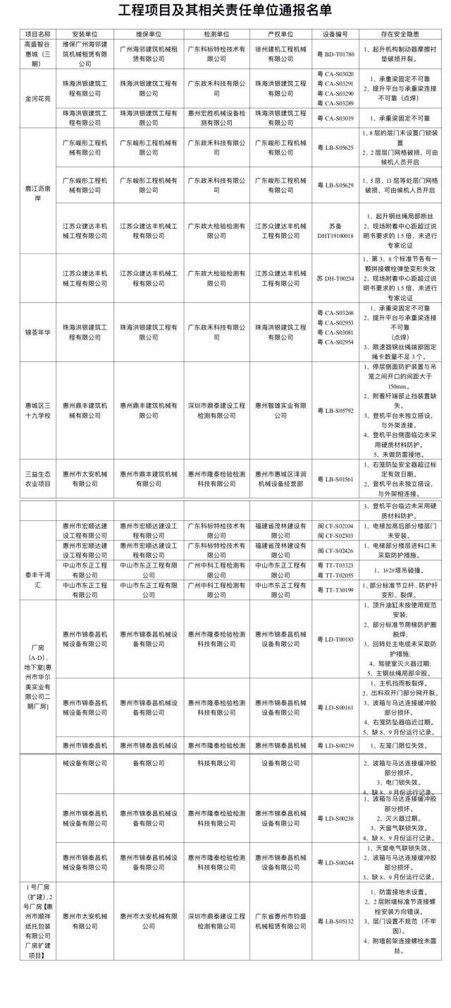 惠城區(qū)住房和城鄉(xiāng)建設(shè)局相關(guān)負責人介紹,對未落實危大工程分項現(xiàn)場管理制度的在建項目,要求施工單位項目負責人上手嚴抓,指定危大工程分項責任人,監(jiān)理單位負責跟蹤落實具體工作實施,完善危大工程分項臺賬資料;對管理人員未在崗履職且現(xiàn)場存在較大安全事故隱患的在建項目,現(xiàn)場下發(fā)《停工通知書》責令立即停工整改,并對相關(guān)人員采取動態(tài)扣分處理;對建筑起重機械安裝、維護保養(yǎng)工作責任意識不強,未按安全技術(shù)標準對設(shè)備進行安全檢查,現(xiàn)場建筑起重機械存在嚴重安全隱患的建筑起重機械安裝、維保、產(chǎn)權(quán)、檢測、使用單位進行通報批評。