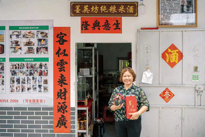 “很受歡迎,有不少回頭客。很多游客都循酒香而來,品嘗購買。除了自用,還有不少游客當手信帶回去。”英姐在外打拼多年的兒子朱美錠如今也回到墨園村,幫助家里經營墨英酒坊的銷售門店——英姐農產品店。他表示,不少游客主動加其微信后,時常在線上訂購,目前店里基本每天有訂單發(fā)往周邊城市。憑借著傳統(tǒng)工藝釀造的好酒,墨英酒坊正成為墨園村文旅的一景,以酒文化為載體,講述墨園村的發(fā)展故事。
