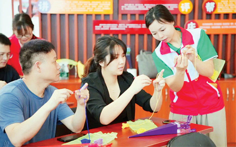 社區(qū)居民在老師的指導下學習手工編織。 惠州日報記者謝菁菁 通訊員謝意 攝