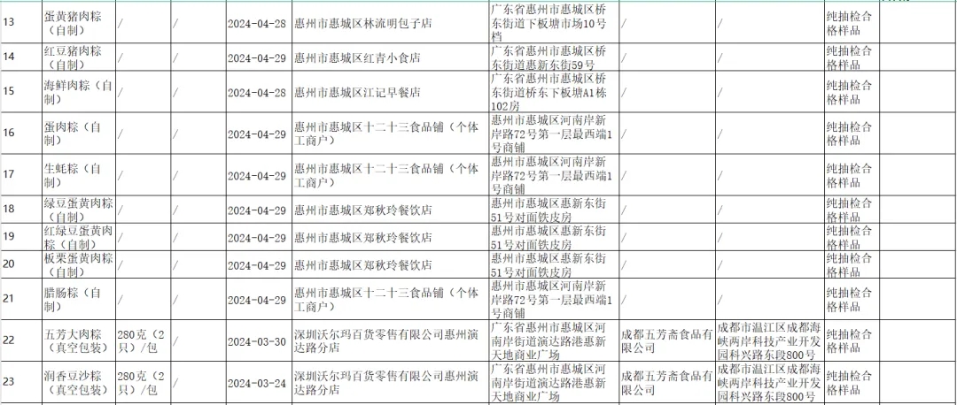 抽檢過程中,工作人員依據(jù)GB 2760-2014《食品安全國家標(biāo)準(zhǔn) 食品添加劑使用標(biāo)準(zhǔn)》、GB 29921-2021《食品安全國家標(biāo)準(zhǔn) 預(yù)包裝食品中致病菌限量》、SB/T 10377-2004《粽子》、GB 19295-2021《食品安全國家標(biāo)準(zhǔn) 速凍面米與調(diào)制食品》等標(biāo)準(zhǔn)的要求,對樣品的山梨酸及其鉀鹽、脫氫乙酸及其鈉鹽、糖精鈉、安賽蜜、甜蜜素、過氧化值、商業(yè)無菌、金黃色葡萄球菌、沙門氏菌、大腸菌群、菌落總數(shù)、霉菌等指標(biāo)進行了檢驗,結(jié)果顯示,60件樣品全部符合相關(guān)食品安全標(biāo)準(zhǔn),監(jiān)督抽檢合格率為100%。