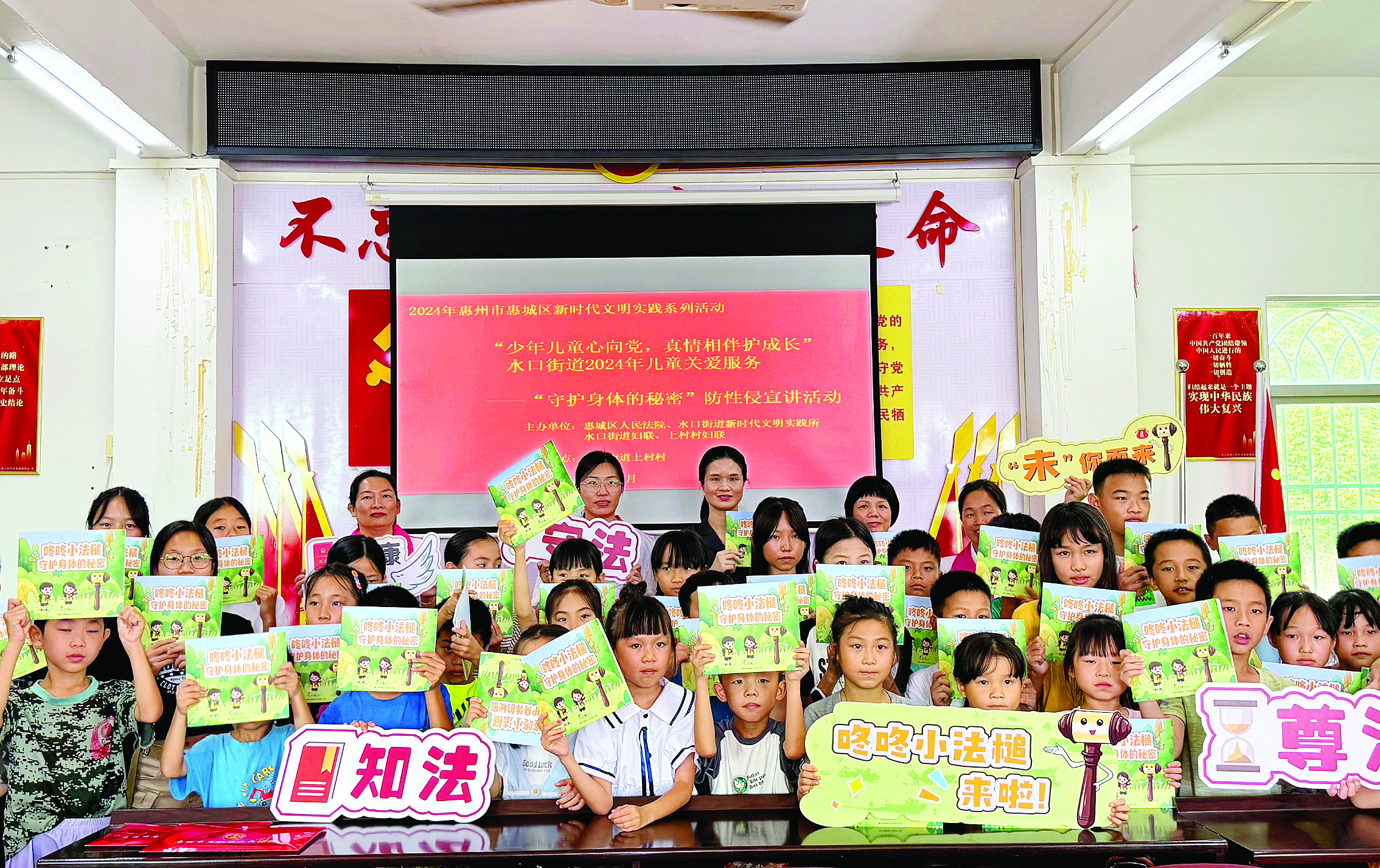惠州日?qǐng)?bào)訊 (記者謝菁菁 特約通訊員黎華容 通訊員胡雅婷 黃麗心)日前,惠城區(qū)水口街道婦聯(lián)聯(lián)合惠城區(qū)人民法院在上村村委會(huì)“婦女兒童之家”舉辦以“少年兒童心向黨,真情相伴護(hù)成長(zhǎng)”為主題的少年兒童關(guān)愛服務(wù)活動(dòng)。活動(dòng)以防性侵主題講座及防溺水宣教為主,通過親子互動(dòng)、普法宣講、繪本共讀、體驗(yàn)游戲等環(huán)節(jié),助力提高兒童的安全防范意識(shí)和自我保護(hù)能力。