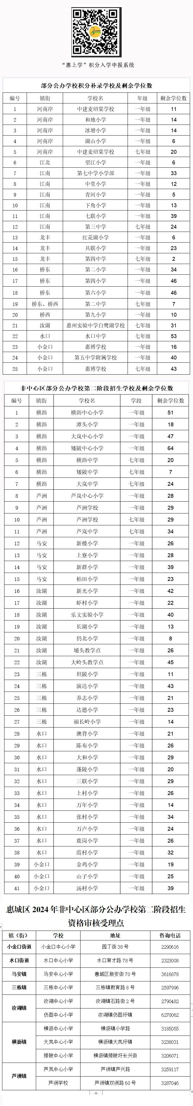 根據(jù)省、市教育行政主管部門2024年招生工作相關(guān)文件精神,為充分利用好公辦學(xué)校剩余學(xué)位,現(xiàn)將有關(guān)2024年惠城區(qū)部分公辦學(xué)校積分補(bǔ)錄及非中心區(qū)部分公辦學(xué)校第二階段招生工作說(shuō)明如下: