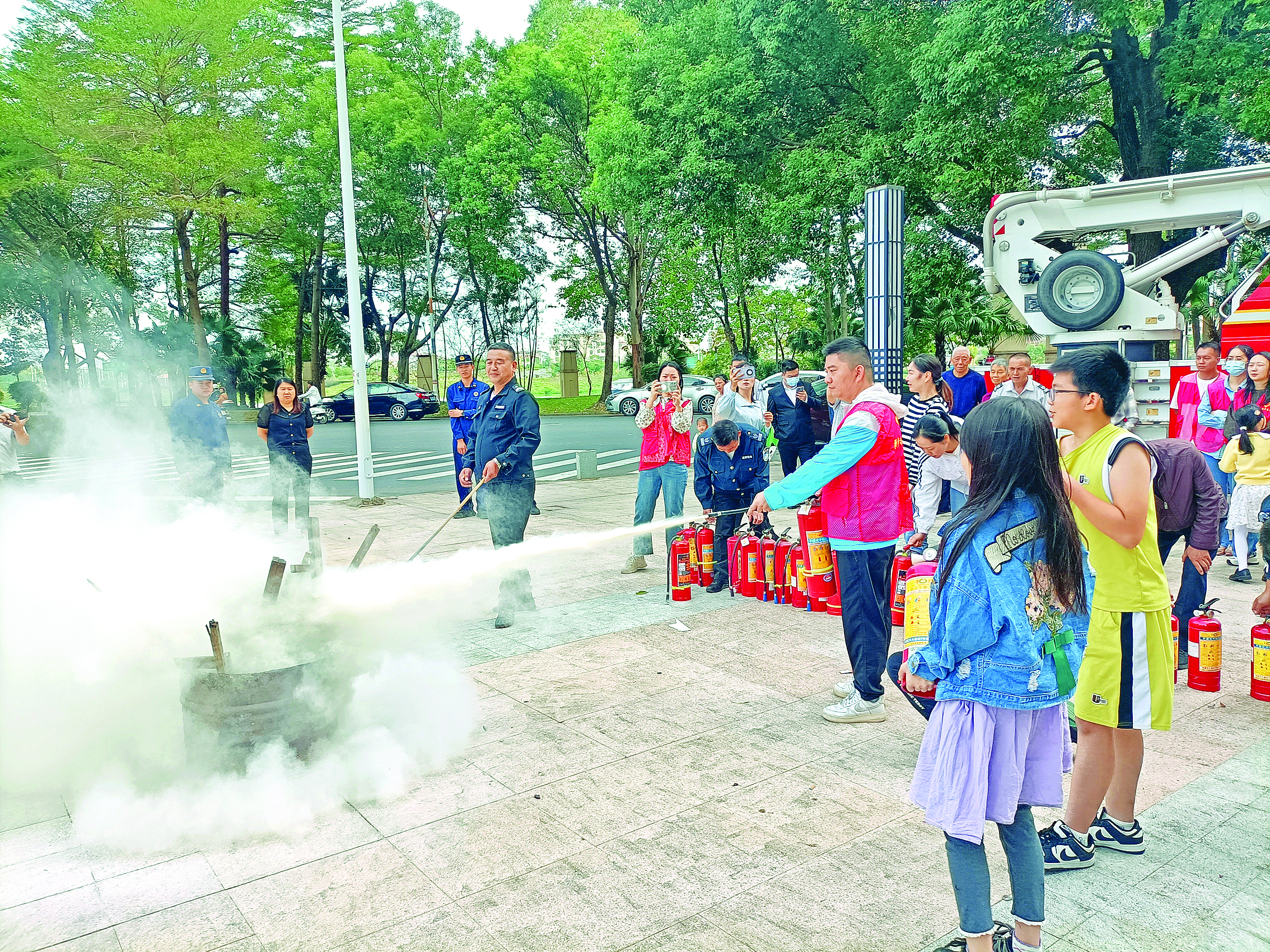 居民學(xué)習(xí)滅火器的使用。惠州日?qǐng)?bào)記者謝菁菁 通訊員朱俊霞 林曉娜 攝