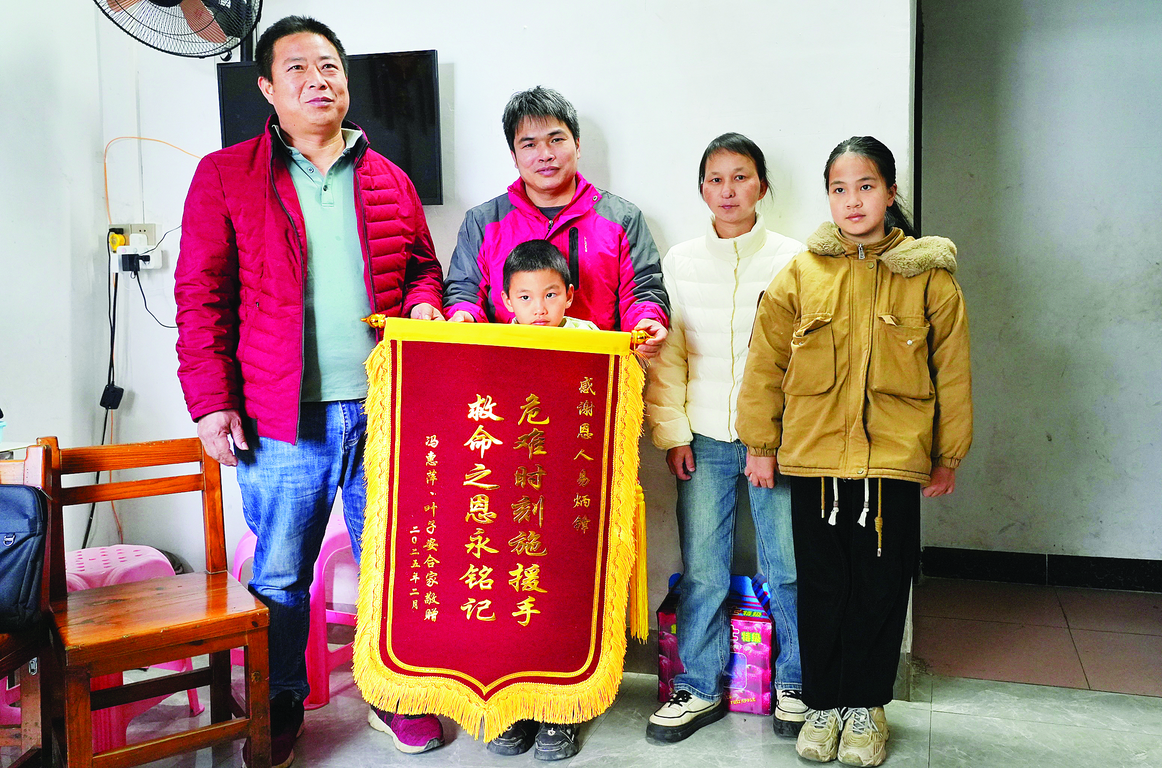 馮惠萍一家向易炳鋒(左一)贈(zèng)送錦旗。惠州日?qǐng)?bào)記者朱金贊 攝
