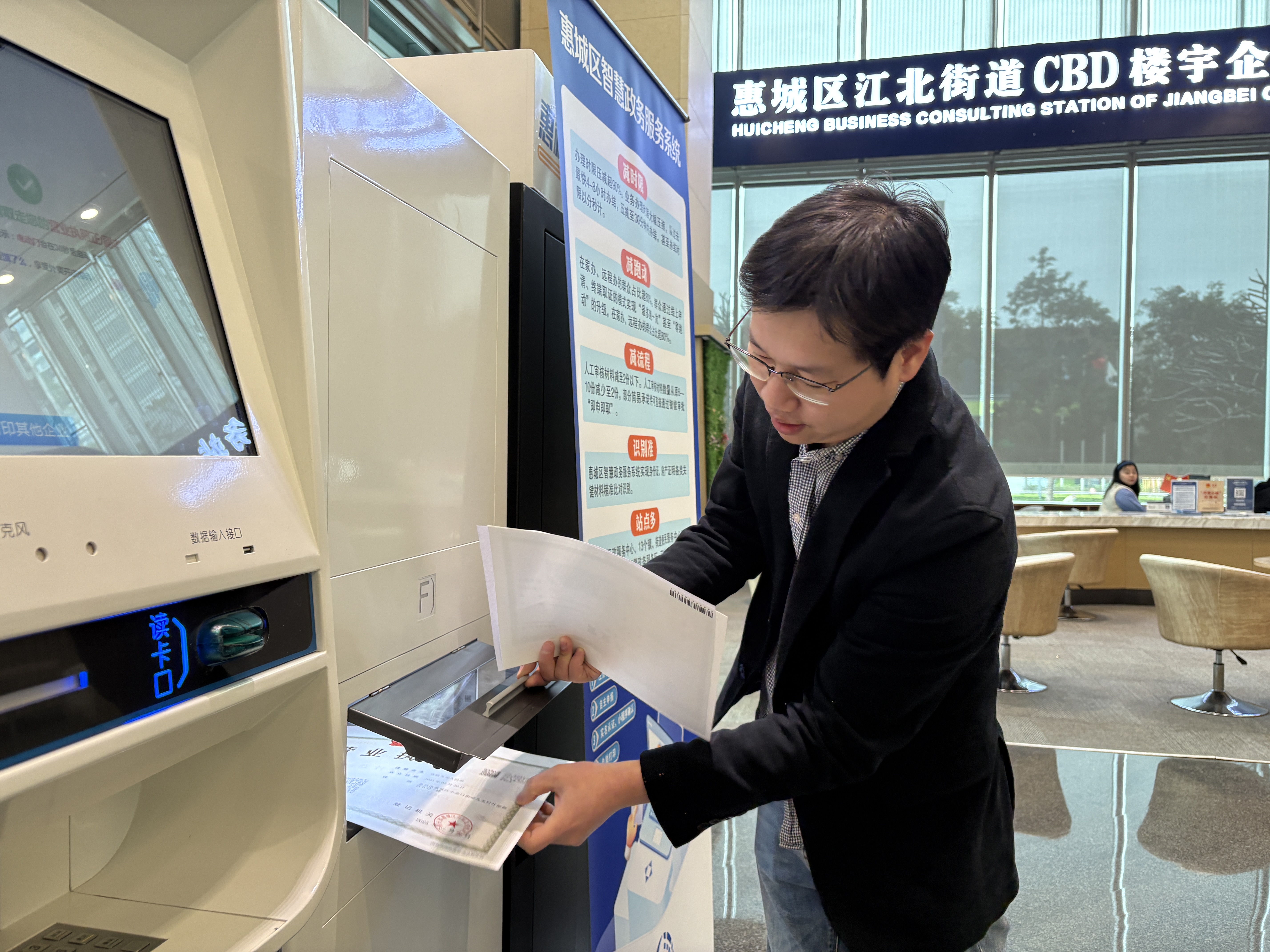 在惠城區(qū)江北街道華貿(mào)天地CBD樓宇企業(yè)服務(wù)站,市民杜雨峻僅用15分鐘就完成公司注冊(cè)的所有手續(xù)。“以前要跑好幾趟,現(xiàn)在動(dòng)動(dòng)手指就能線上搞定,樓下的自助機(jī)就能打印營業(yè)執(zhí)照。”