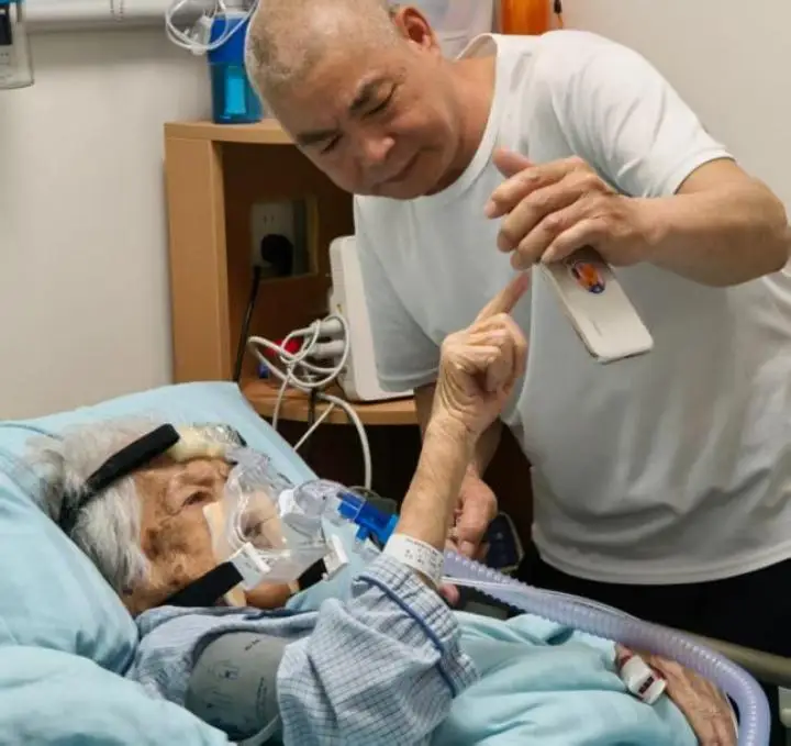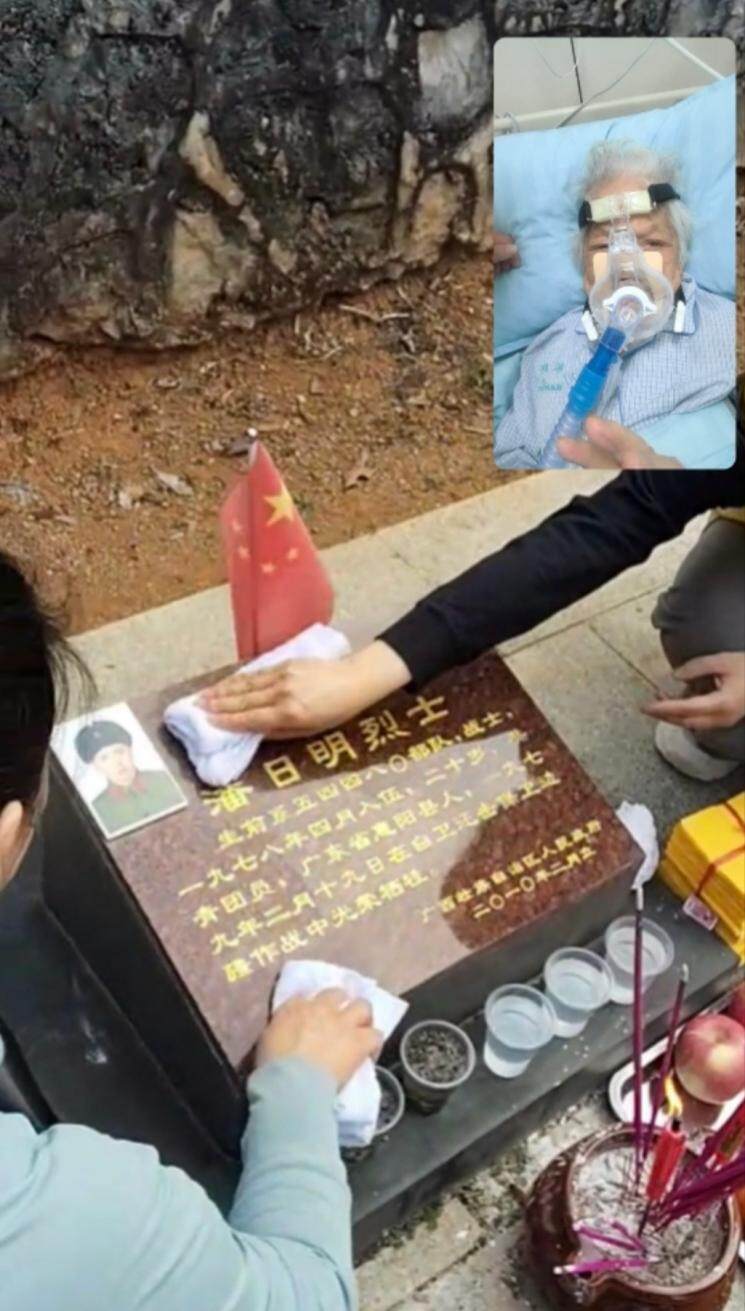 相隔998公里,看著工作人員在潘日明烈士墓前為烈士獻(xiàn)上祭品、清洗擦拭墓碑、鞠躬致敬,尤其是當(dāng)鏡頭拍到墓碑上長(zhǎng)子的照片時(shí),躺在病床上的涂奶奶不禁眼眶含淚,她用顫抖的手指不停嘗試觸碰鏡頭,似乎想穿過(guò)鏡頭再次撫摸兒子的臉龐。