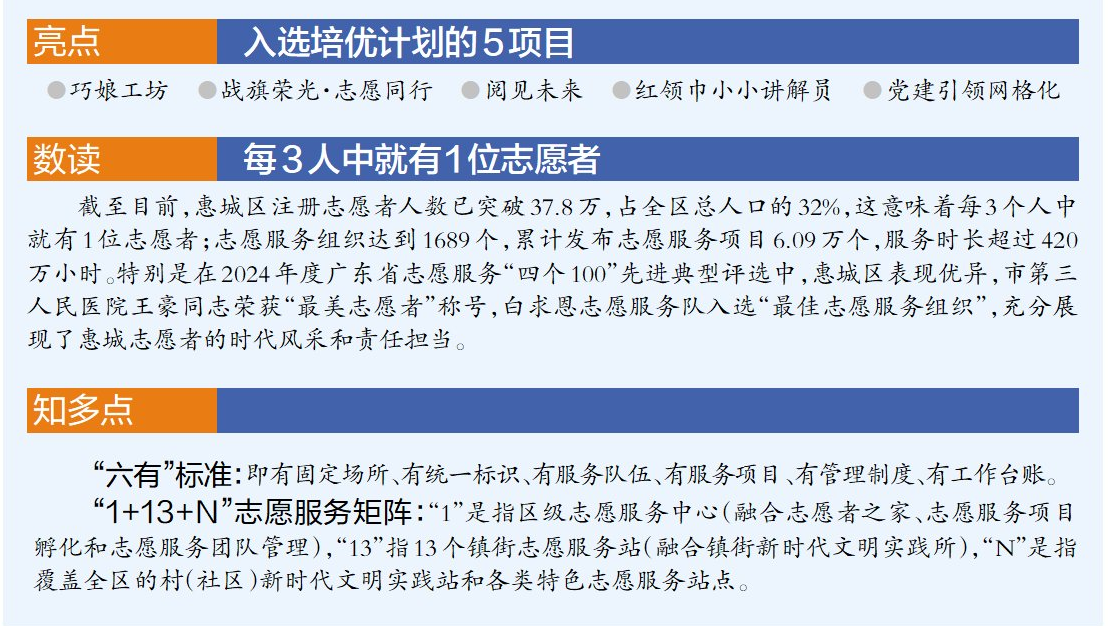 惠城區(qū)將按照“六有”標(biāo)準(zhǔn),全面推進(jìn)“區(qū)—鎮(zhèn)街—村(社區(qū))”三級(jí)志愿服務(wù)陣地建設(shè)。重點(diǎn)打造“1+13+N”志愿服務(wù)矩陣,積極推動(dòng)公共場(chǎng)所建設(shè)志愿服務(wù)站點(diǎn),讓志愿服務(wù)更加貼近群眾、服務(wù)群眾。統(tǒng)籌用好財(cái)政資金和社會(huì)資源,設(shè)立“惠城區(qū)志愿服務(wù)基金”,支持民生志愿服務(wù)項(xiàng)目發(fā)展。