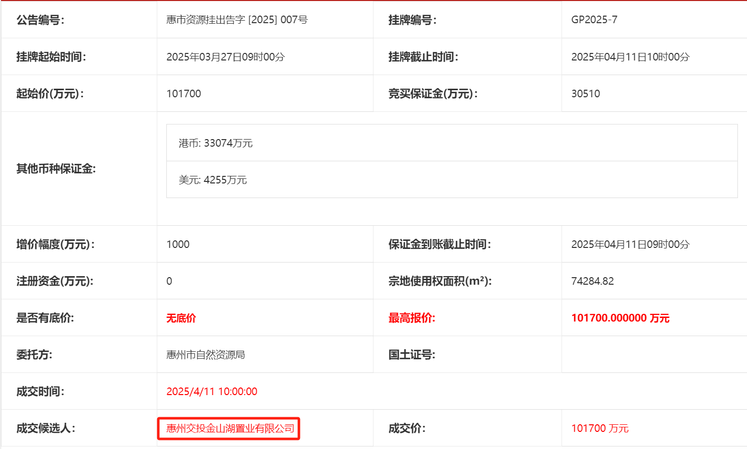此次摘牌的惠州交投金山湖置業(yè)有限公司成立于2022年,是惠州交投利臻置業(yè)有限公司100%控股的子公司。惠州交投官網(wǎng)顯示,惠州交投利臻公司是惠州交投集團(tuán)核心二級(jí)企業(yè)之一。