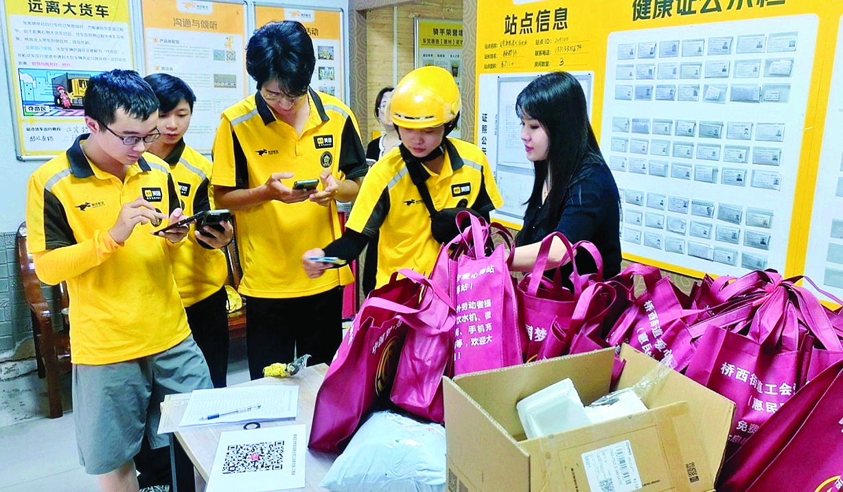 工會(huì)工作人員利用配送早會(huì)、午休間隙,在街頭巷尾和站點(diǎn)門(mén)口設(shè)立臨時(shí)服務(wù)點(diǎn),為網(wǎng)約車(chē)司機(jī)、外賣(mài)騎手、快遞小哥等詳細(xì)講解工會(huì)組織的權(quán)益保障政策。