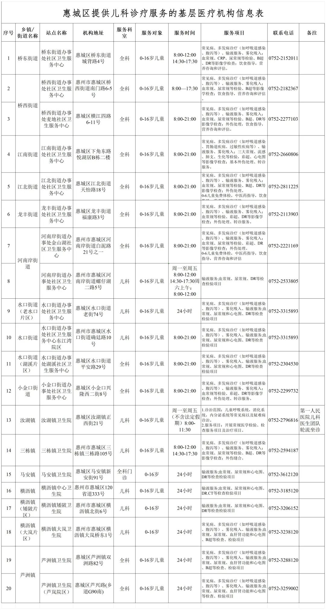 為積極應(yīng)對(duì)秋冬季呼吸道疾病,進(jìn)一步方便惠城區(qū)兒童患者就醫(yī),根據(jù)國(guó)家衛(wèi)生健康委員會(huì)相關(guān)工作要求,現(xiàn)將我區(qū)提供兒科診療服務(wù)的基層醫(yī)療衛(wèi)生機(jī)構(gòu)(鄉(xiāng)鎮(zhèn)衛(wèi)生院、社區(qū)衛(wèi)生服務(wù)中心)相關(guān)信息予以公布。以下明細(xì)表包含機(jī)構(gòu)名稱、機(jī)構(gòu)地址、服務(wù)科室、服務(wù)對(duì)象、服務(wù)項(xiàng)目及服務(wù)時(shí)間等核心內(nèi)容,旨在為家長(zhǎng)選擇兒童就醫(yī)機(jī)構(gòu)提供清晰指引,保障兒童診療需求高效對(duì)接。