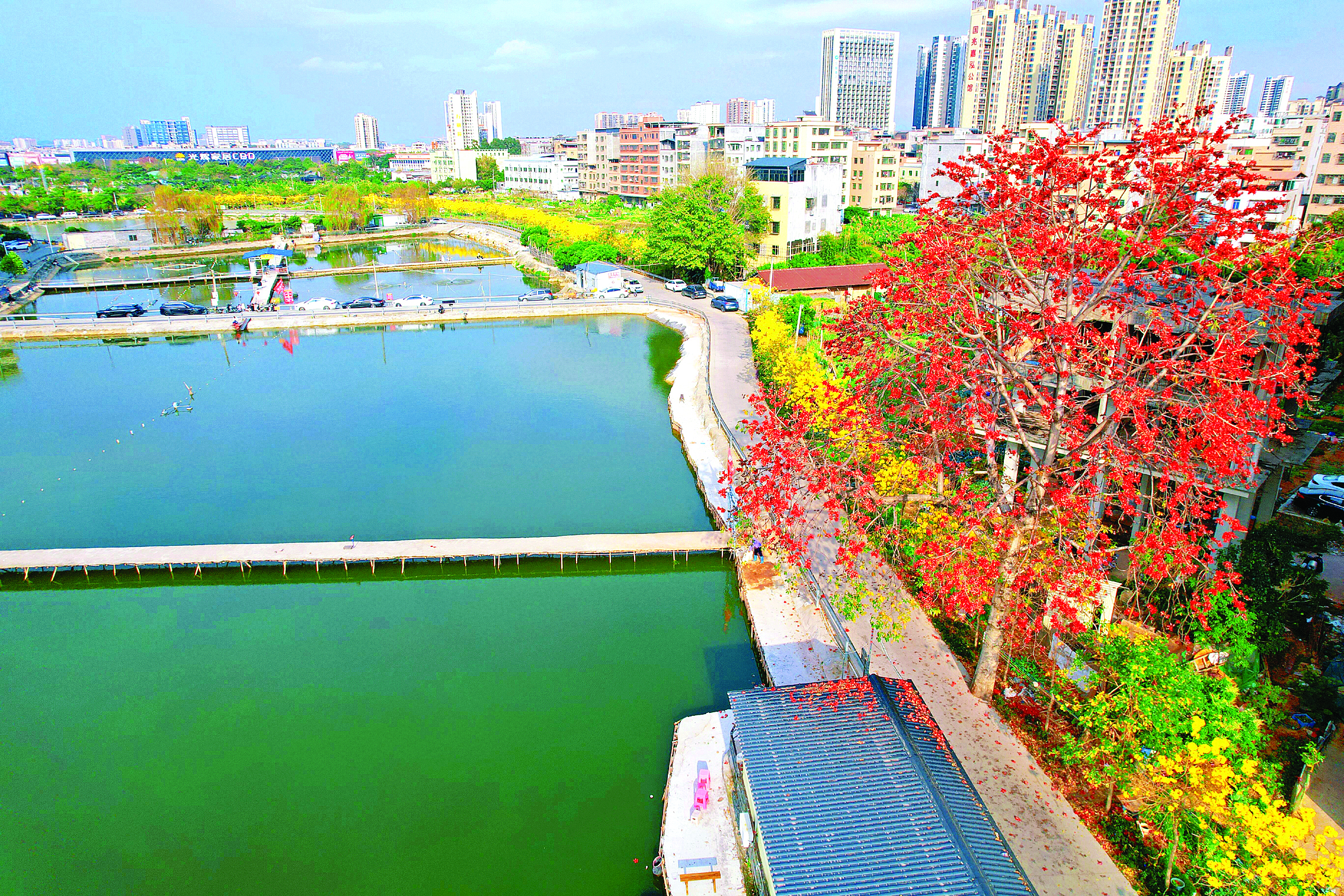 龍津村金黃色的黃花風鈴木與鮮紅的木棉花相映成趣。惠州日報記者謝菁菁 通訊員楊瑜珞 陳巧梅 攝