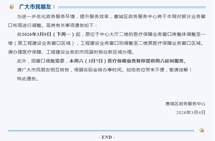 注意!惠城區(qū)部分業(yè)務窗口有調整