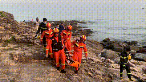 海邊礁石凹凸不平而且濕滑,稍有不慎就會(huì)對(duì)傷者造成二次傷害。因此,救援人員小心地將傷者固定在擔(dān)架上,輕輕抬起擔(dān)架,盡可能平穩(wěn)地將傷者從崎嶇不平的礁石上抬至平地等待醫(yī)護(hù)人員的到來(lái)。