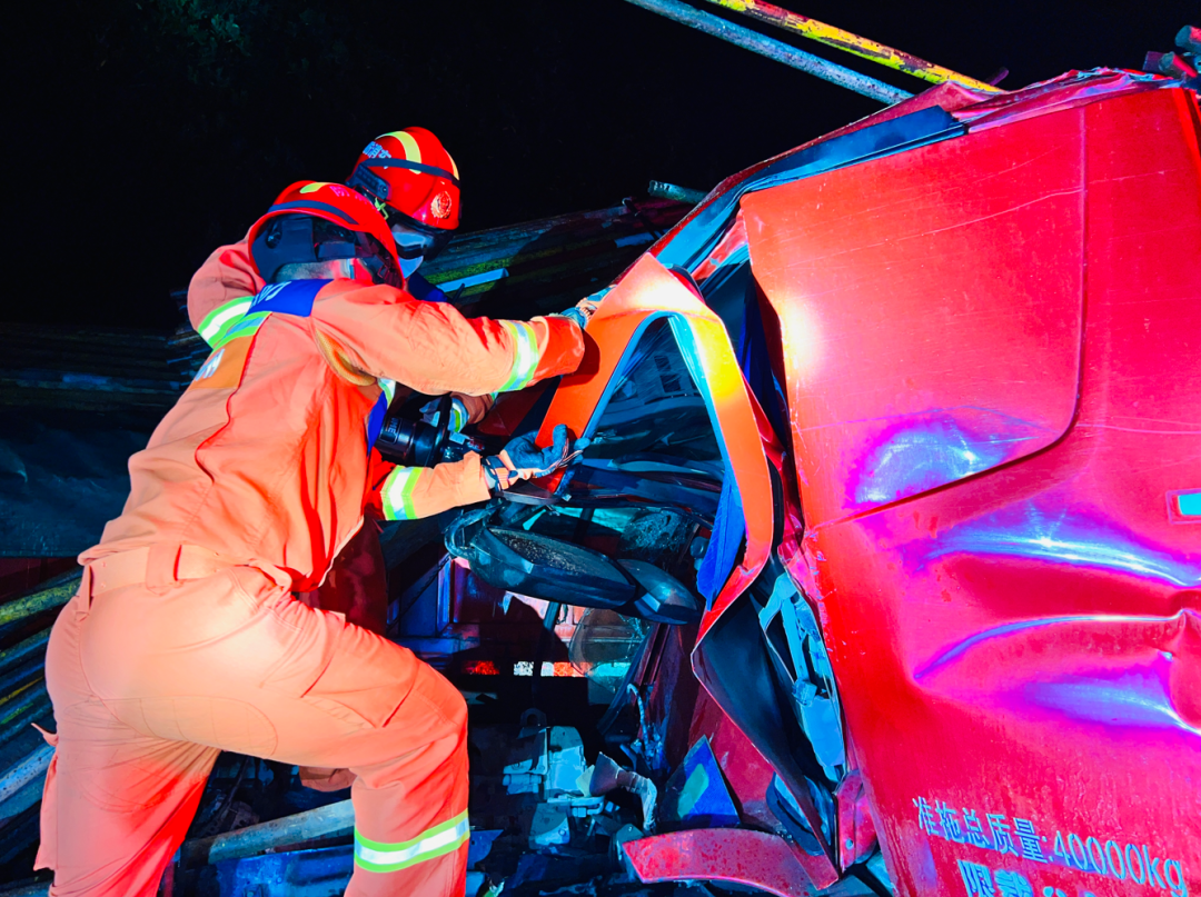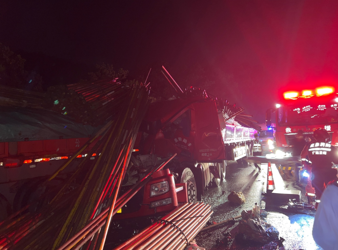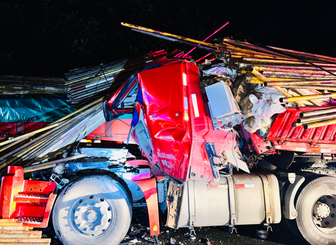 現(xiàn)場消防員發(fā)現(xiàn)2輛大貨車追尾相撞停在高速路邊,車上貨物鋼管受慣性甩出散落在道路及車頂上,貨車車頭嚴(yán)重變形,造成駕駛員被困在車內(nèi)無法活動(dòng)。