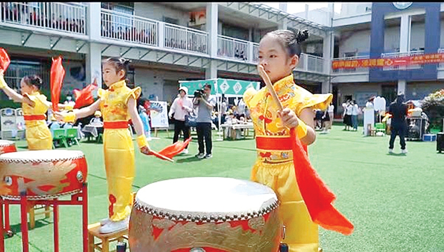 當(dāng)天早上,由師生共同表演的省級非物質(zhì)文化遺產(chǎn)項(xiàng)目吉隆舞龍在幼兒園操場上進(jìn)行,酷似成年人的舞龍步伐、小朋友的喝彩聲拉開了整場展演活動的序幕。