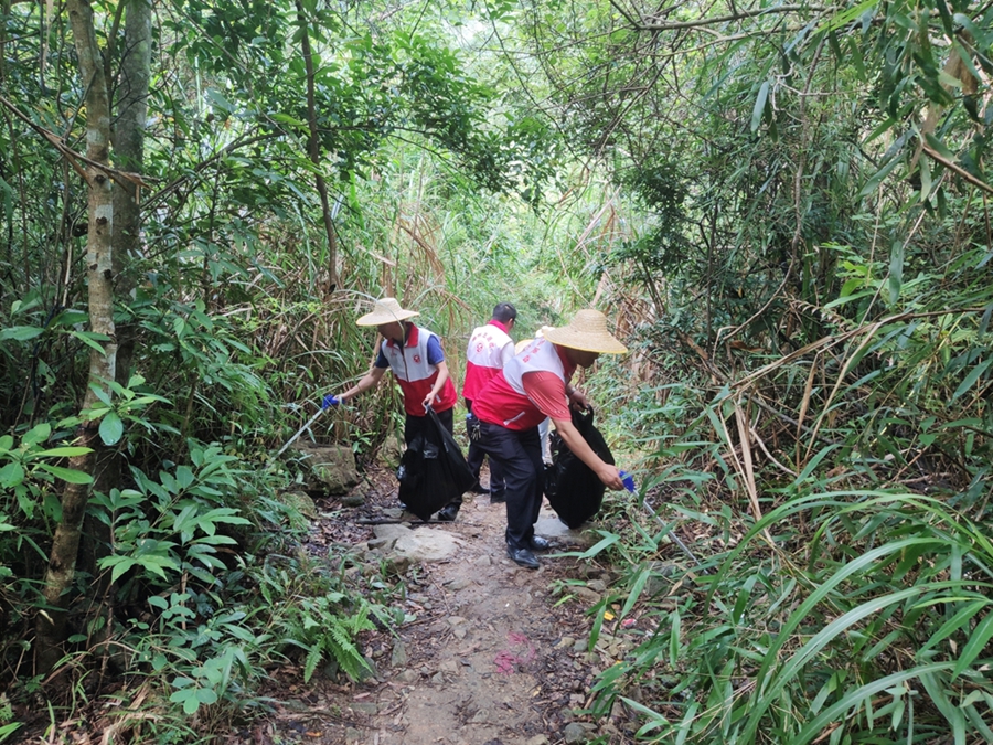 志愿者沿著登山徒步路線清理垃圾。 惠州日?qǐng)?bào)記者藍(lán)斐菲 通訊員陳超 攝