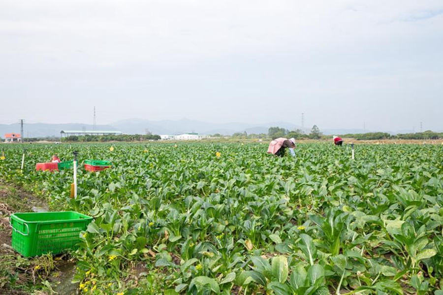 工人在惠東縣蔬菜省級現(xiàn)代農(nóng)業(yè)產(chǎn)業(yè)園基地采收蔬菜。