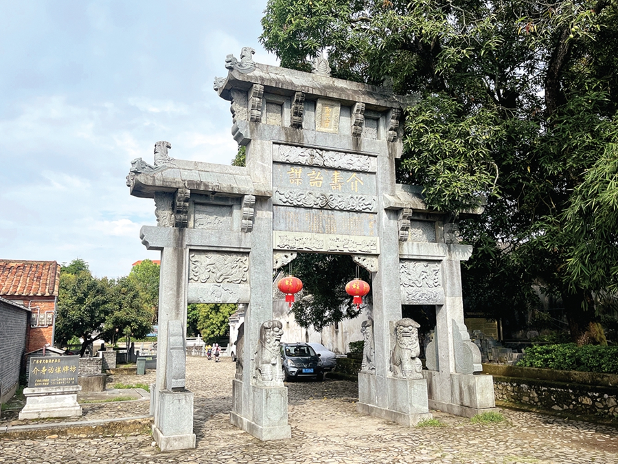 皇思揚(yáng)段是平西古道上遺跡留存最多、修繕意義最大的路段。這是省文保單位“介壽詒謀”石牌坊。惠州日報記者洪鵲兒 通訊員賴悅暉 攝