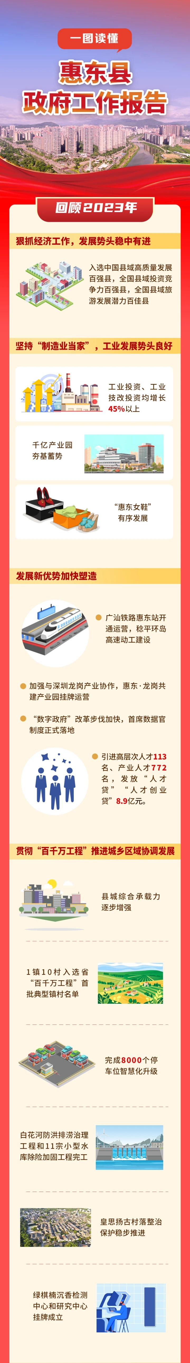 去年以來,惠東縣廣大干部群眾團結拼搏、苦干實干,搶抓發(fā)展機遇,沉著應對挑戰(zhàn),經(jīng)濟社會保持穩(wěn)中向好的發(fā)展態(tài)勢。2024年,是實現(xiàn)“十四五”規(guī)劃目標任務的關鍵一年,惠東縣將以頭號工程力度實施“百千萬工程”,持續(xù)推動經(jīng)濟實現(xiàn)質的有效提升和量的合理增長,增進民生福祉,保持社會穩(wěn)定,為惠東邁進GDP千億縣行列奠定堅實基礎。