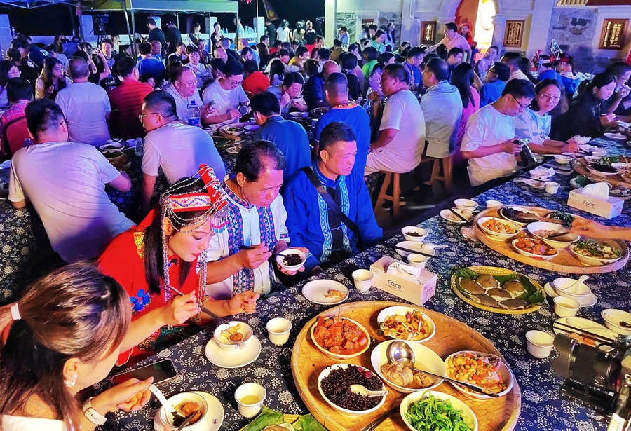 隨著夜幕降臨,盛大的長(zhǎng)桌宴和篝火晚會(huì)將節(jié)日氛圍推向高潮。長(zhǎng)桌宴上,賓客們圍坐一堂,共享美食,感受著畬族人的團(tuán)結(jié)與熱情。篝火晚會(huì)上,畬族青年男女載歌載舞。