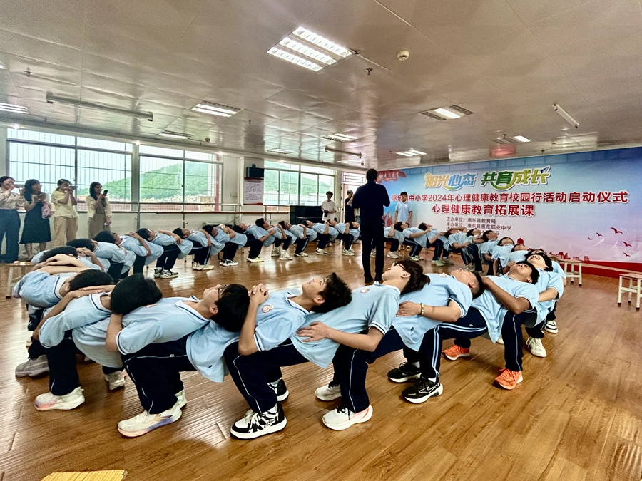 心理健康教育校園行活動(dòng)啟動(dòng)儀式現(xiàn)場(chǎng),同學(xué)們參與團(tuán)體心理拓展活動(dòng)。