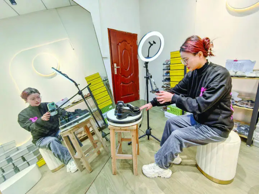 惠東女鞋企業(yè)員工直播帶貨。惠州日?qǐng)?bào)記者陳濤