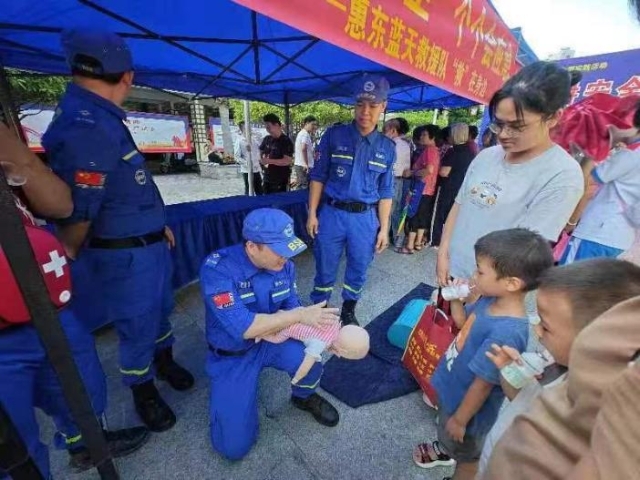 藍(lán)天救援協(xié)會(huì)隊(duì)員為群眾開展應(yīng)急救護(hù)培訓(xùn)。 惠州日?qǐng)?bào)記者蔡偉健 特約通訊員葉衍達(dá) 攝