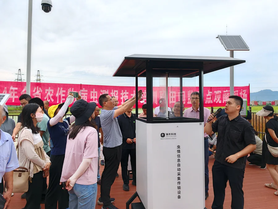 “模擬雌蟲性成熟時所散發(fā)的性激素,引誘雄蟲過來,達到殺蟲和監(jiān)測的效果”、“燈光誘集田間害蟲進入設(shè)備,儀器自動拍照識別、殺蟲,上傳相關(guān)數(shù)據(jù)”……活動現(xiàn)場,工作人員詳細(xì)講解各種智能化產(chǎn)品的技術(shù)原理和作用。