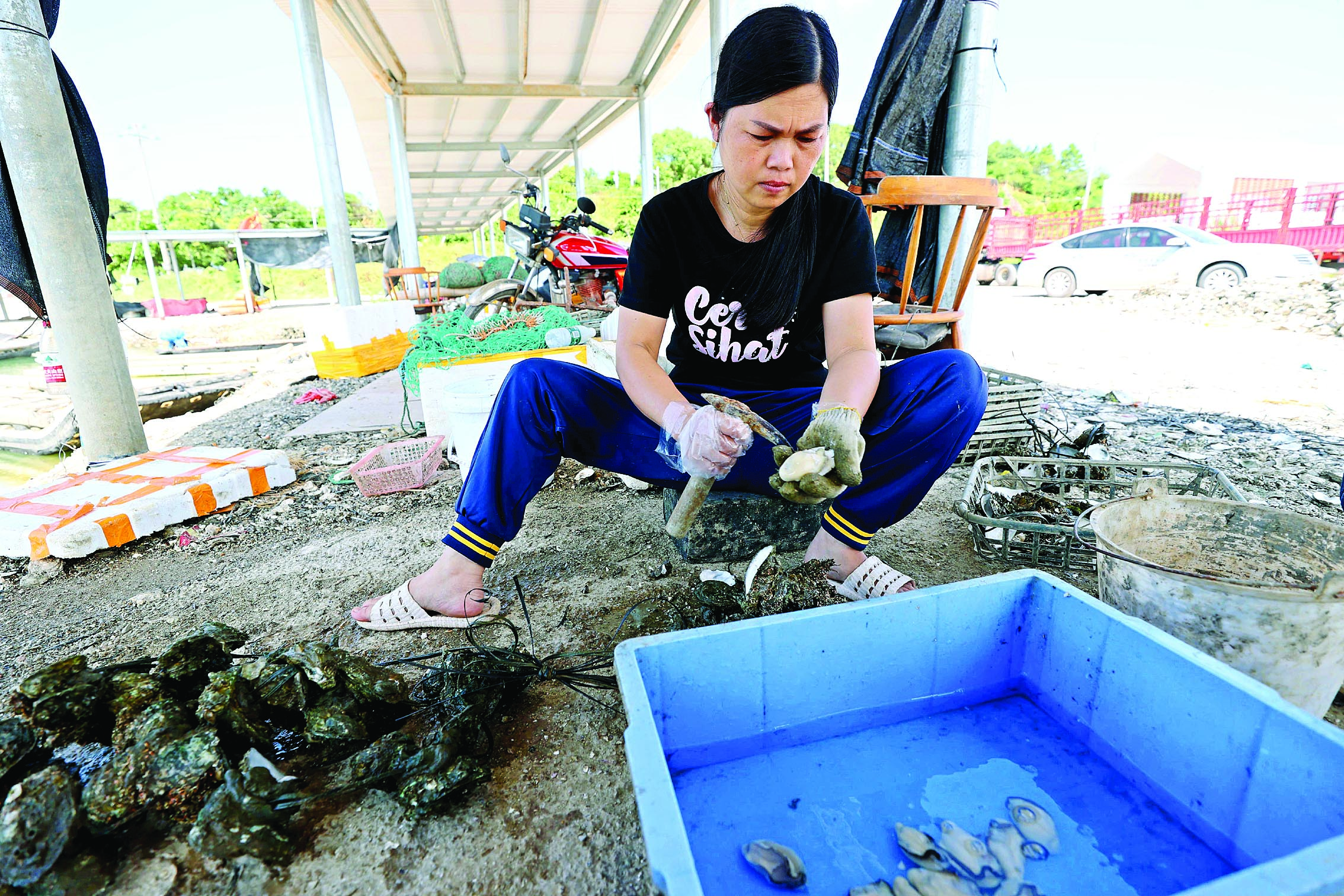 鐵架棚下,村民一字排開(kāi),動(dòng)作麻利地用工具撬開(kāi)蠔殼,“duang”地露出奶白色蠔肉,甚是誘人;不遠(yuǎn)處,一撥撥村民駕著漁船出海,從蠔排邊拉上一串串蠔埕,滿(mǎn)載而歸……每年10月到來(lái)年3月,是惠東縣鐵涌鎮(zhèn)赤岸村生蠔采收旺季,蠔農(nóng)每天忙個(gè)不停地為大眾送上當(dāng)季美味。