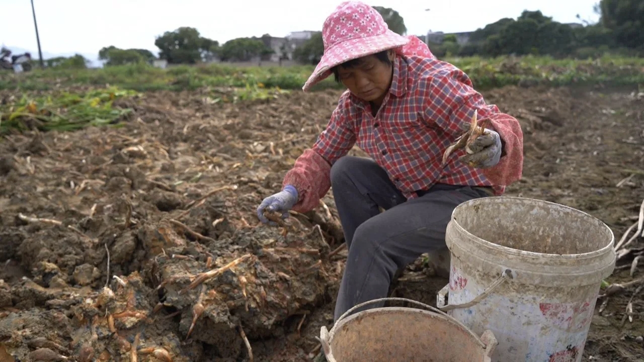 記者在讀光村看到,半人高的茨菰植株已經(jīng)成熟,茨菰被松軟的泥土覆蓋著,寬大的葉片交錯鋪展在泥土上。田地里,種植戶們挽起褲腿,揮動鐵耙,翻挖泥土,很快,一顆顆圓潤飽滿、裹著泥漿的茨菰便接二連三地露出身子。