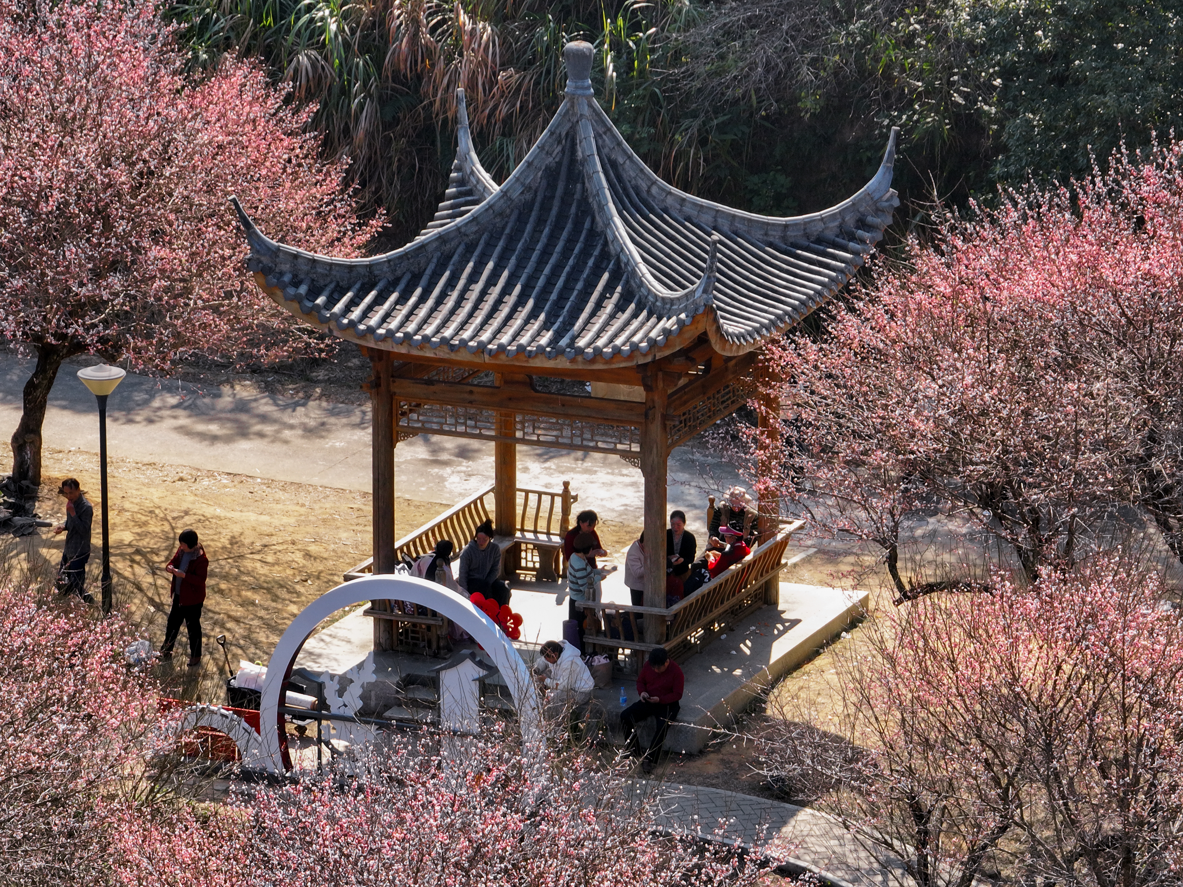 梅樹下,人們?nèi)宄扇海醽碜赖剩瑪[上水果點(diǎn)心,邊吃邊聊,悠閑賞梅。