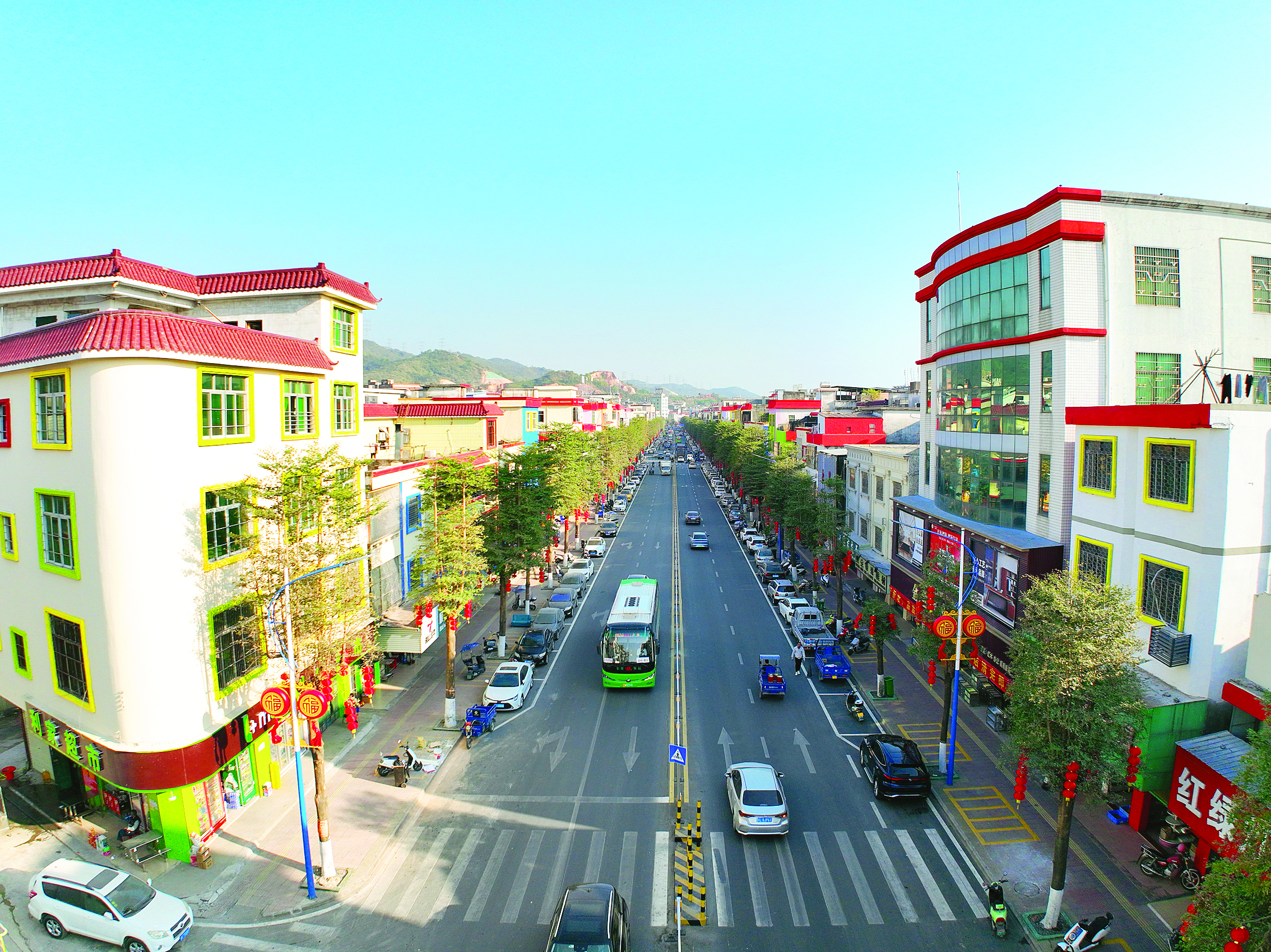 走進(jìn)吉隆鎮(zhèn),沿河路段的房屋外立面讓人眼前一亮。據(jù)介紹,在充分尊重群眾意愿和圩鎮(zhèn)風(fēng)貌特色的基礎(chǔ)上,吉隆鎮(zhèn)著重對(duì)沿河西上路與沿河西下路沿街建筑外立面的屋頂、外墻、窗戶等要素進(jìn)行提升改造,使昔日的老舊路段蝶變?yōu)榧ㄐ小⑿蓍e、觀景于一體的濱水亮麗風(fēng)景線。在吉隆鎮(zhèn)美麗示范主街道人民路,3357米的道路提質(zhì)升級(jí),沿街外立面風(fēng)貌改造提升,主街沿線還建有完善的人行道、行道樹、路燈、景觀設(shè)施及路邊停車空間。