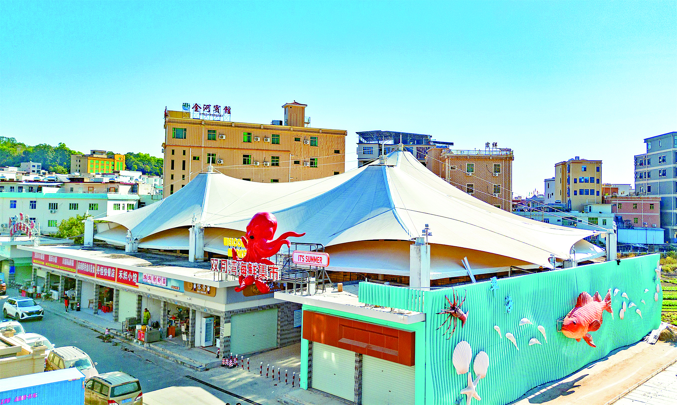 “寄居蟹‘爬’上墻了。”“你看,好可愛的河豚,肥嘟嘟的。”“好大的石斑魚,好逼真。”如今,不少游客來到平海鎮(zhèn)的龍泉大街上,都對海洋風(fēng)情統(tǒng)一打造的街容街貌贊嘆不已。平海鎮(zhèn)相關(guān)負(fù)責(zé)人介紹,這是該鎮(zhèn)不久前完成打造的濱海風(fēng)情示范主街,也是該鎮(zhèn)美麗圩鎮(zhèn)“七個一”項目之一。據(jù)介紹,該鎮(zhèn)以龍泉大街為核心,打造全長1.2公里的濱海風(fēng)情示范主街,以“湖青色+亮白色”為主色調(diào),完成外立面粉刷及全段瀝青路面鋪設(shè),新設(shè)停車位278個,統(tǒng)一沿街200余家商鋪招牌風(fēng)格,96棟連片外立面提升,將寄居蟹、魚蝦等海洋元素融入街景設(shè)計,迎來“全域美”的嶄新蛻變。