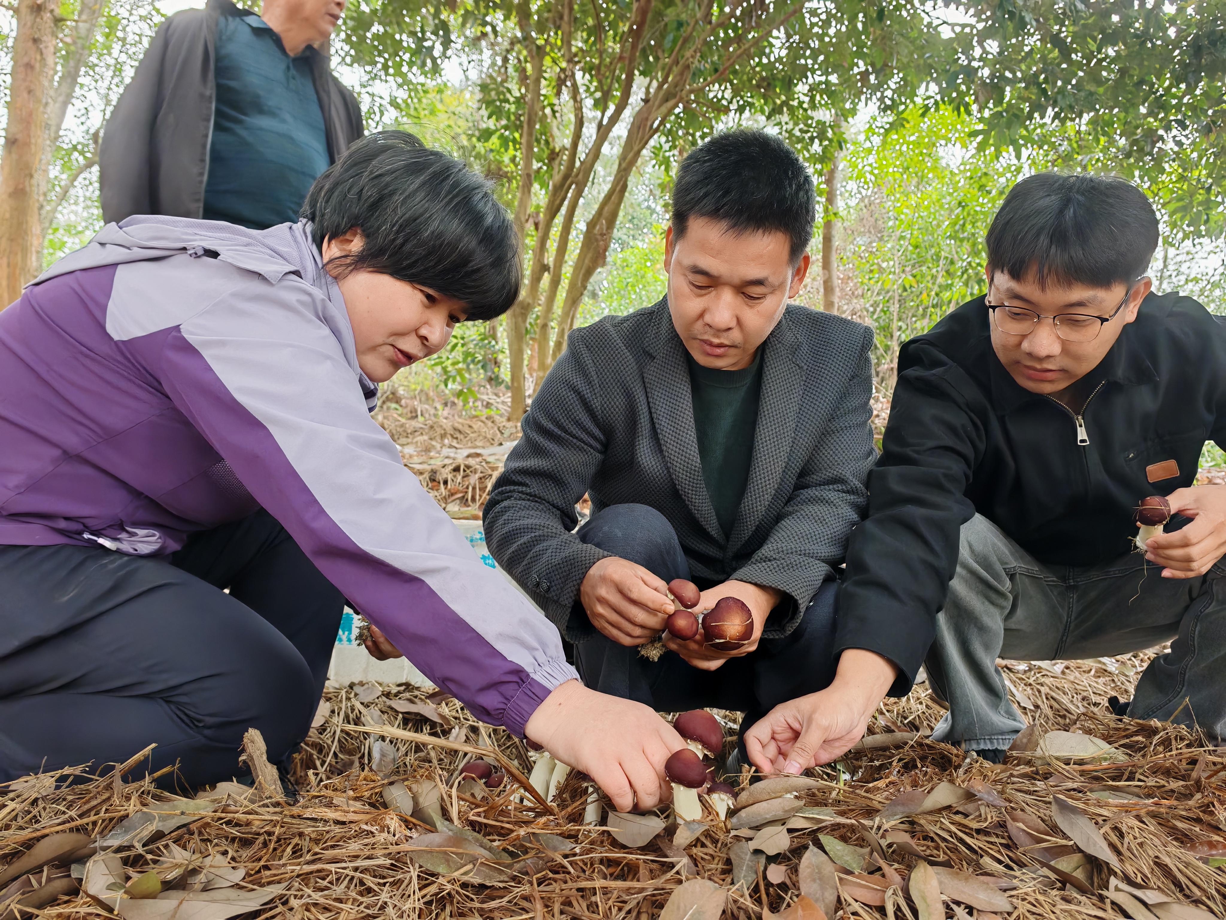 惠州學(xué)院農(nóng)村科技特派員團隊查看紅松茸長勢。
