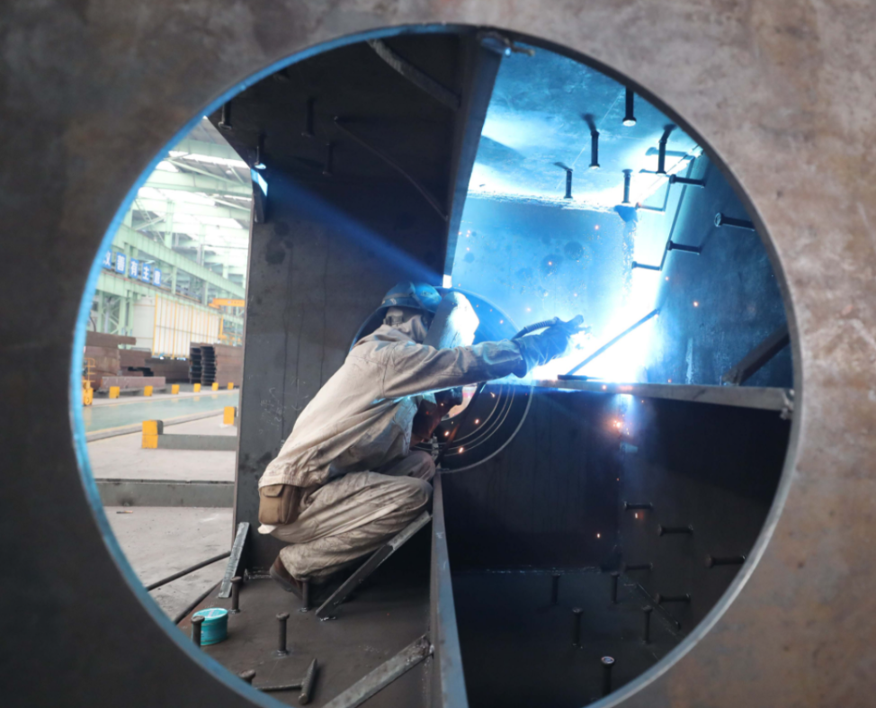 2022年規(guī)模以上工業(yè)總產(chǎn)值達(dá)1841.20億元,增長(zhǎng)6.6%,增速位居全市第2。圖為中建鋼構(gòu)車間內(nèi)工人在作業(yè)。