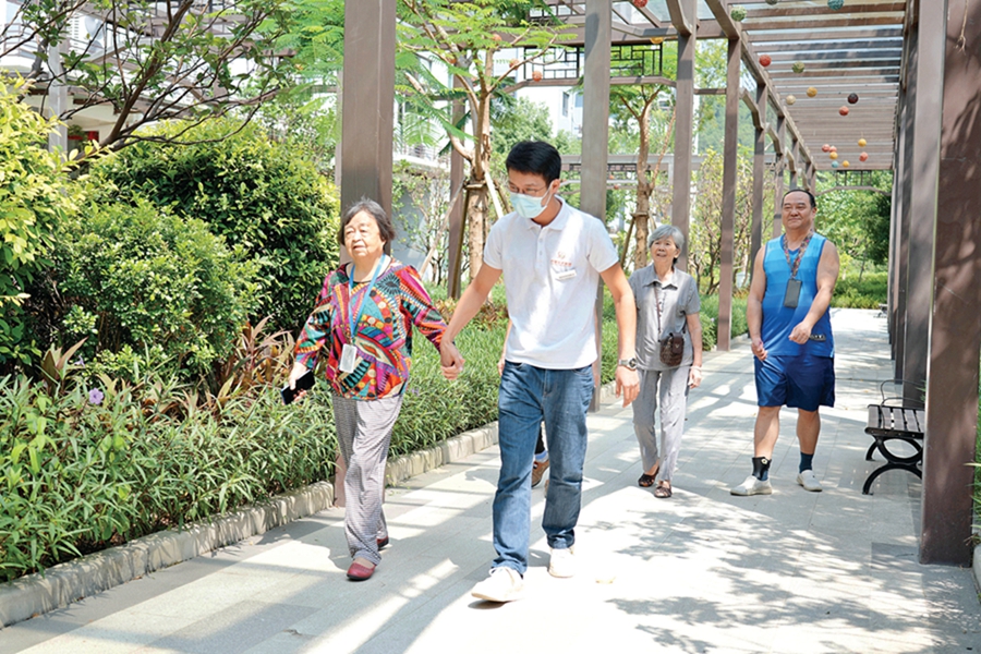 惠陽區(qū)長(zhǎng)者安養(yǎng)中心工作人員陪老人散步。 惠州日?qǐng)?bào)記者許文昌 攝