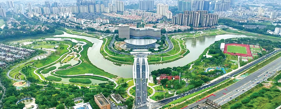 俯瞰之下,惠陽(yáng)淡水半島橋與毗鄰的惠陽(yáng)體育會(huì)展中心、格蘭云天大酒店構(gòu)成一把吉他造型。如今,環(huán)繞半島橋兩側(cè)及周邊而建的濱水公園,仿佛余音繞梁的旋律,美妙自得。