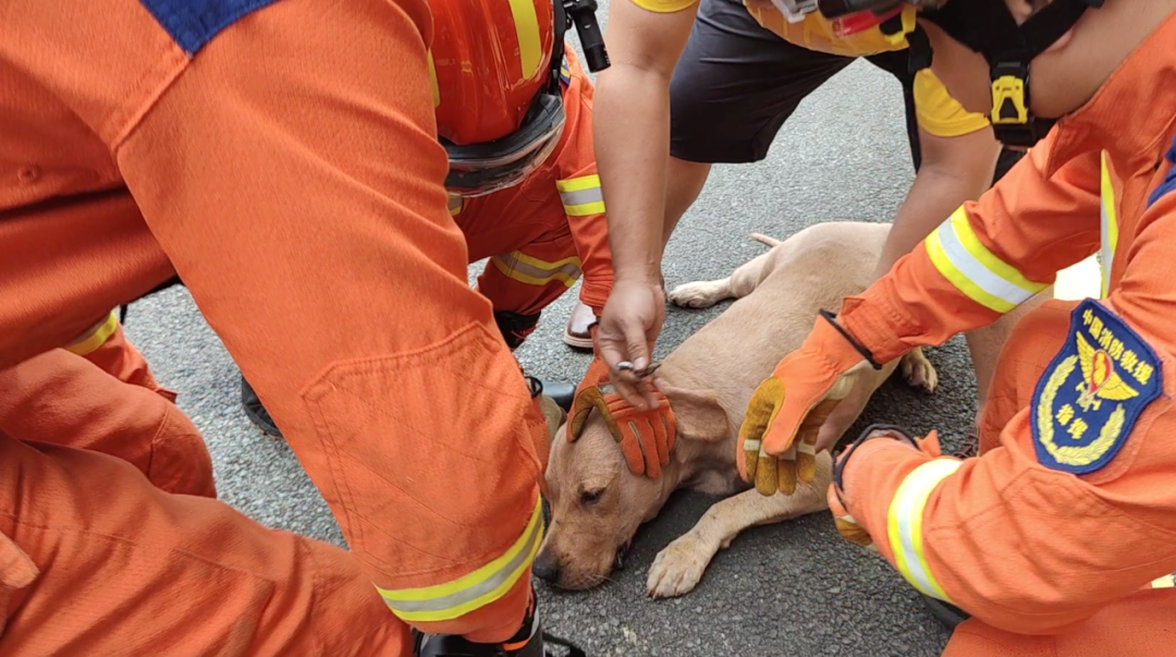 由于套住時間過長,“金毛”的牙齦已經(jīng)出血,稍微觸碰安全鉤都會給它帶來巨大的痛感而進行反抗。消防員建議這對夫妻先到附近寵物醫(yī)院給狗狗打麻醉后再實施救助。