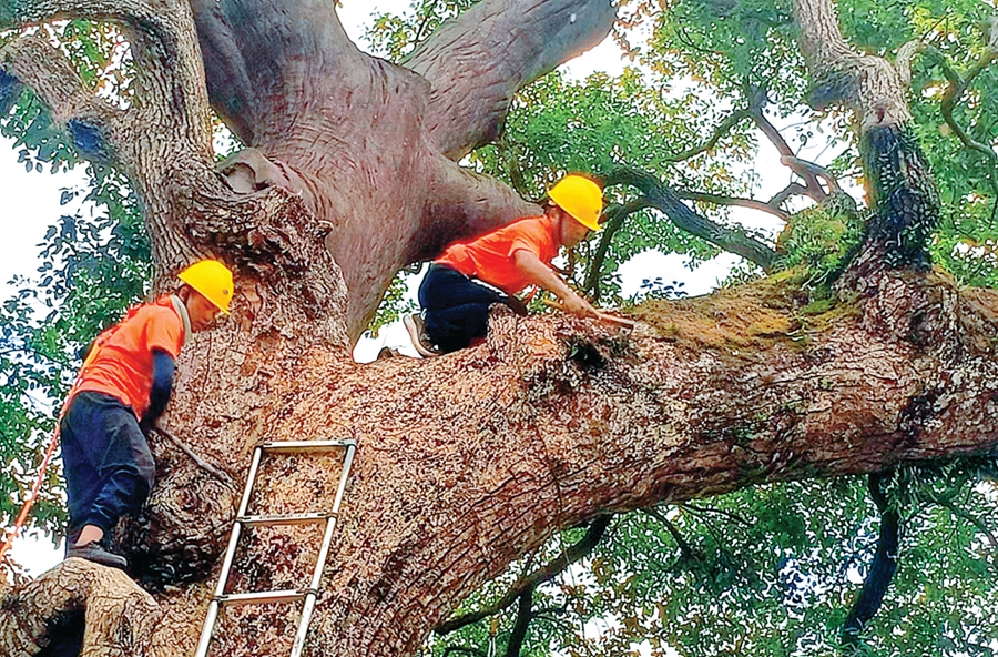 工人在古樹(shù)旁豎保護(hù)牌。 惠州日?qǐng)?bào)記者李芳娟 攝