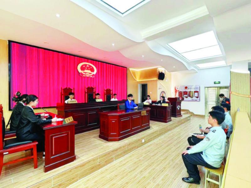 模擬法庭上,學(xué)生們分飾審判長、人民陪審員、書記員、公訴人、被告人及辯護人等角色,模擬開庭審理一起涉嫌宣揚恐怖主義、極端主義罪的案件,增強青少年的國家安全意識和法治意識。