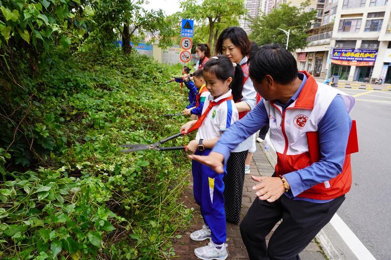 隨后,該校少先隊(duì)員代表及其家長(zhǎng)、星河丹堤志愿服務(wù)隊(duì)等60人,在星河社區(qū)開(kāi)展“綠美廣東 紅領(lǐng)巾在行動(dòng)”紅領(lǐng)巾親子護(hù)綠活動(dòng)暨紅領(lǐng)巾獎(jiǎng)?wù)聽(tīng)?zhēng)章活動(dòng)。在志愿者的帶領(lǐng)下,紅領(lǐng)巾親子家庭干勁十足地修剪綠化帶,展示少先隊(duì)員們參與“綠美廣東”行動(dòng)的決心。