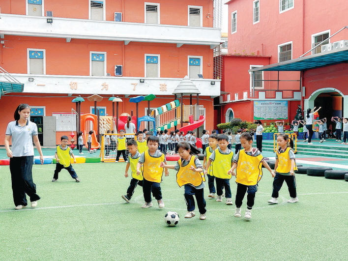 幼兒園里,孩子們在快樂地踢足球。 惠州日報(bào)記者李芳娟 攝